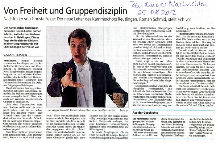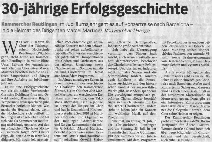 Universitätskurs Música en Compostela, in dem er den Preis Rosa Sabater bekam. Marcel Martínez hat an zahlreichen Meisterkursen teilgenommen, unter anderem bei L. F. Tagliavini, M. Radulescu, M. Imbruno und W. Rübsam. Außerdem bildete er sich als Chorleiter bei Conxita Garcia und Manuel Cabero aus und studierte Kunstgeschichte an der Universitat Autònoma de Barcelona. Nach seinem Studium an der Hochschule für Kirchenmusik Rottenburg absolvierte Marcel Martinez den Masterstudiengang Musikwissenschaft an der Universität Tübingen. Zur Zeit arbeitet er an seiner Dissertation. Marcel Martínez ist Kantor an der Stephanuskirche in Tübingen und leitet den Kammerchor Reutlingen. Schwäbisches Tagblatt vom 07.07.2017 Mit freundlicher Genehmigung des Schwäbischen Tagblattes Reutlinger Nachrichten vom 16.03.2016 Mit freundlicher Genehmigung der Reutlinger Nachrichten Reutlinger Generalanzeiger vom 15.03.2016 Mit freundlicher Genehmigung des Reutlinger Generalanzeigers |